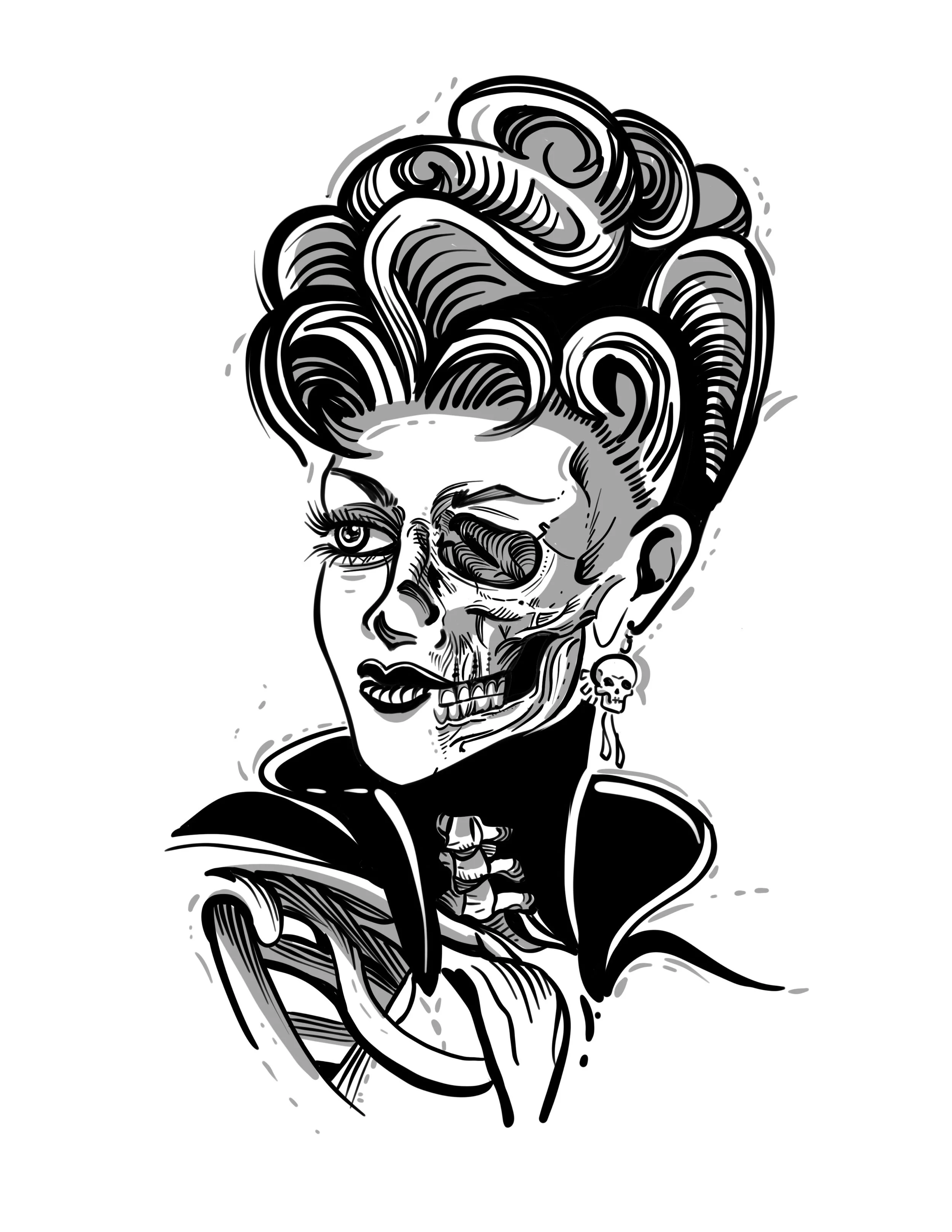 This tattoo design draws inspiration from American traditional pin-up girls, presented from a contemporary perspective. The artwork skillfully combines elegance and edginess, with a skeleton figure emerging to create a striking contrast between beauty and mortality.